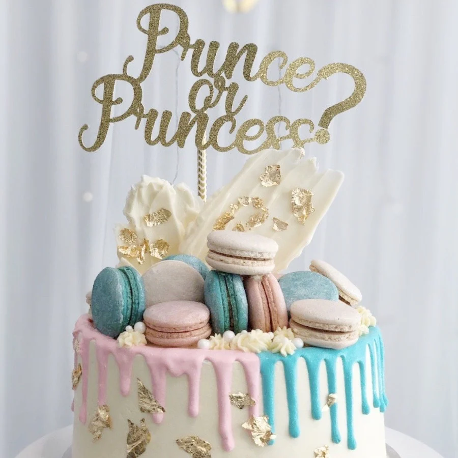 Congratulations on your little gift from heaven! Perhaps you might need a Gender Reveal – Prince or Princess cake to celebrate your future son or daughter’s imminent arrival? This gender reveal customised cake has both pink and blue drippings, has a ‘Prince or Princess?’ cake topper, and is stacked with macarons! If you want a perfect Gender Reveal – Prince or Princess for your gender reveal party, you’ve already found it!